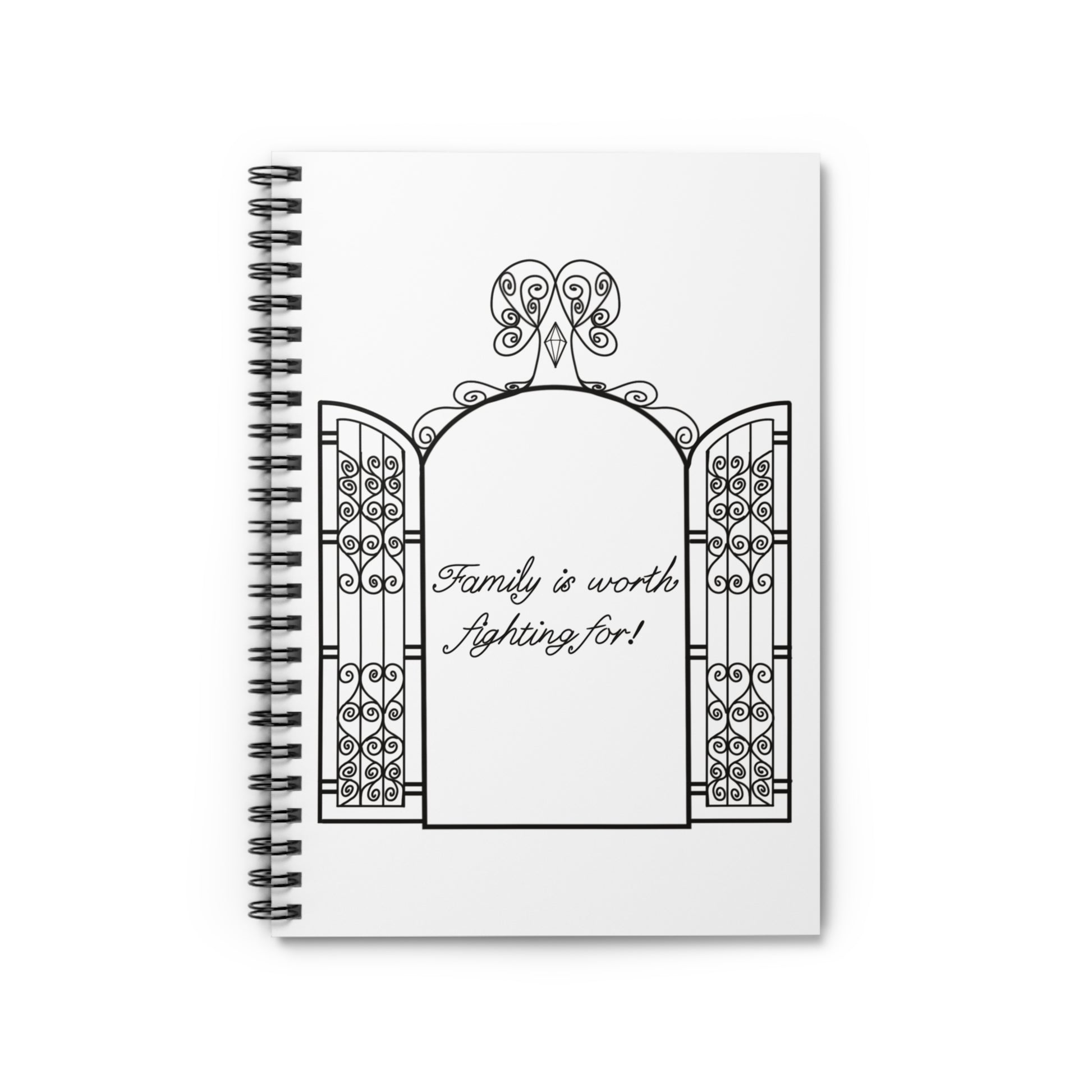 Carry the heart of Hidden Identity with you wherever you write. This spiral notebook features an evocative illustration of an open gate adorned with swirling details and a tree rising above it, with the powerful phrase “Family Is Worth Fighting For!” displayed at its center.