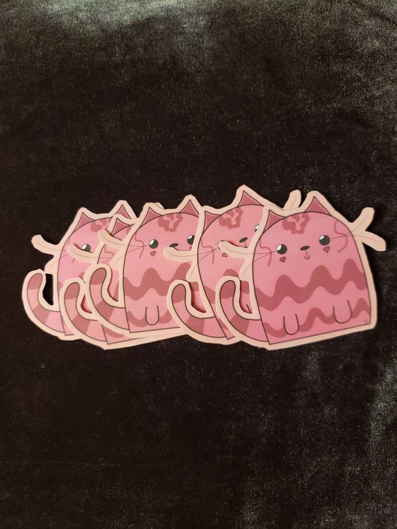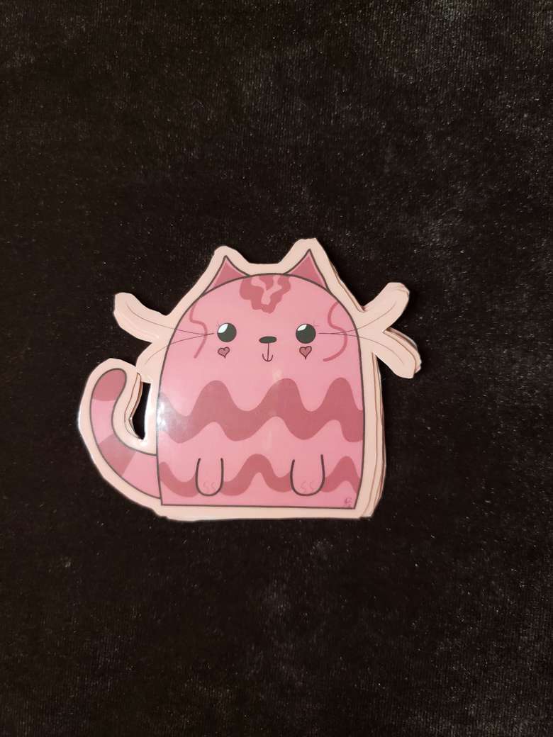 A cute pink kitty. Stickers are approximately 3 inches tall, printed on scratch and tear resistant vinyl, and laminated. Each sticker is hand-cut, so there are slight differences in each one.