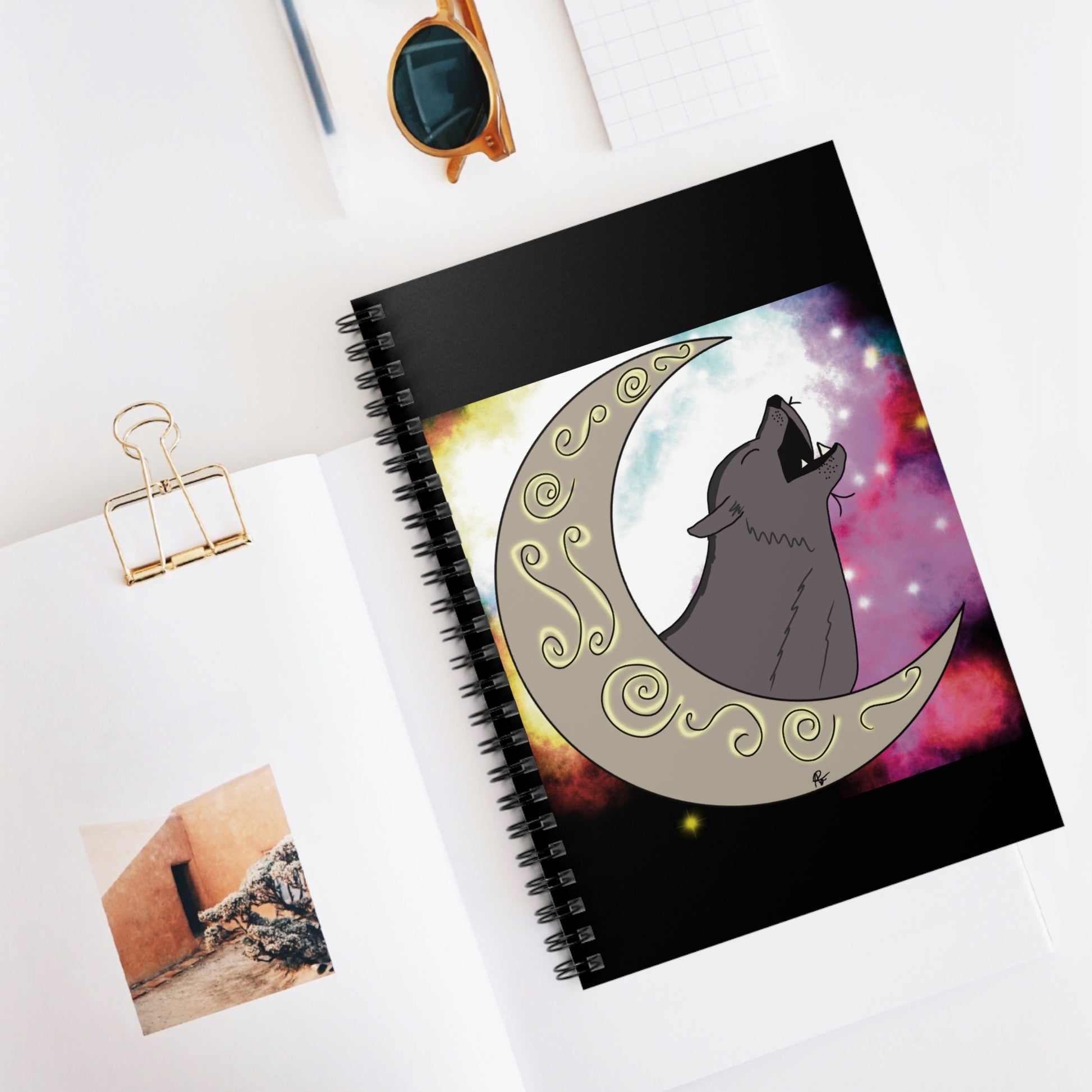 Carry the spirit of Moon Drop Books wherever your ideas take you with this beautifully designed spiral notebook featuring the official Moon Drop Books logo. The artwork showcases a howling wolf framed by a crescent moon, set against a rich galaxy-inspired background—a symbol of creativity, curiosity, and connection across stories and small businesses alike.